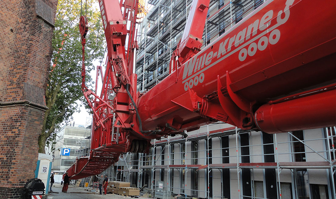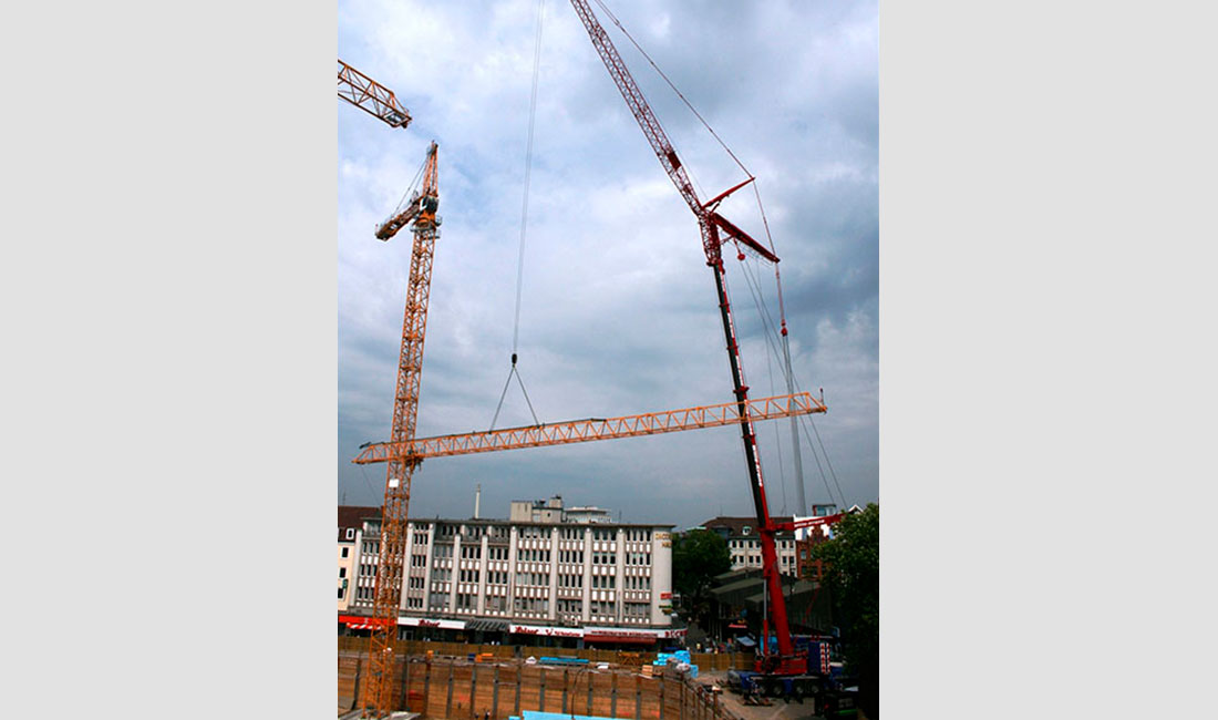 Das spezielle an diesem Auftrag war der Auf.- und Abbau in der Innentstadt von Kiel. Durch die geringen Platzverhältnisse wurde das Anbauen der 42 Meter langen Wippspitze eine Millimeterarbeit.